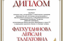 Воспитатель по обучению татарскому языку Фатхутдинова Л.Т. стала Лауреатом в Республиканском конкурсе пьес, инсценировки и тематических сценариев мероприятий для постановки с воспитанниками обучающимися дошкольных и общеобразовательных учреждений Республики Татарстан «Мәктәп сэхнэсе», организованным Министерством образования и науки РТ и редакциями журналов «Сәхнә» и “Салават күпере”