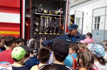 В пришкольном лагере «Радуга» организована экскурсия в ФГКУ «67 пожарная часть ФПС по РТ». Дети познакомились с профессией пожарный спасатель, с техническими возможностями специализированной машины, посмотрели мастер-класс «Тушение пожара».