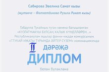 Подведены итоги Республиканского ежегодного молодежного научно-творческого конкурса «Кузгатмакчы булсаң халык күңелләрен...» («Если хочешь затронуть душу народа…»), посвященного дню рождения Г. Тукая. Призером этого конкурса стала Сабирова Эвелина, ученица 7М класса. Поздравляем Эвелину и ее учителя Фатхутдинову Р.Р. Молодцы!