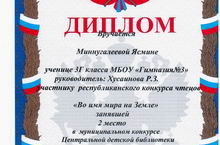 Участник республиканского конкурса чтецов "Во имя мира на Земле" Миннугалеева Я., ученица 3Г кл. МБОУ "Гимназия №3" заняла 2 место в муниципальном конкурсе Центральной детской библиотеки (руков. Хусаинова Р.З.).