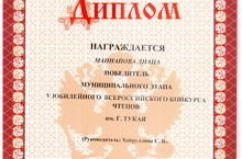 На муниципальном этапе V юбилейного Всероссийского конкурса чтецов имени Г. Тукая ученица 10 кл. Маннапова Д. (руководитель Хайруллина С.В.) получила Диплом победителя...
