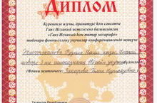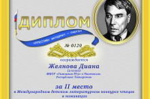 Поздравляем Ахметзянову Р., ученицу 11 Б класса, с победой на межрегиональной НПК, посвященной творчеству великого татарского писателя Г.Исхакый (Учитель :Закирова Г.Н.).