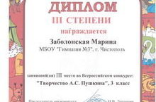 Заболонская М. награждена Дипломом III степени Всероссийского конкурса «Творчество А. С. Пушкина».