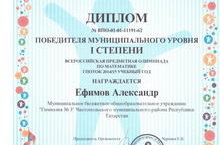 Дипломом I степени муниципального уровня Всероссийской предметной олимпиады «Страна талантов» награжден Ефимов А. ученик 3Г кл. (руководитель Аделева А.А.).