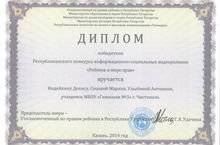 Диплом победителя и сертификат на 20.000 рублей был вручен учащимся 10 кл. нашей гимназии Индейкину Д., Сизовой М., Улыбиной А. и руководителю Тихонову А.А. за социальный видеоролик...