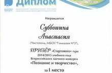 Поздравляем Субботину А., ученицу 1А кл., призера "Стартового" тура Всероссийского заочного конкурса "Познание и творчество", за 1 место в номинации "Веселая грамматика" (1-2 кл.).