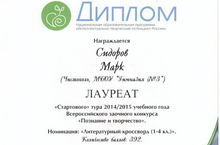 Поздравляем Сидорова М., ученика 1А кл., лауреата "Стартового" тура Всероссийского заочного конкурса "Познание и творчество" в номинации "Литературный кроссворд" (1-2 кл.).
