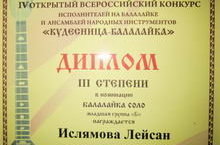 Поздравляем Ислямову Л., ученицу 7Б кл., занявшую III место во Всероссийском конкурсе исполнителей на балалайке и ансамблей народных инструментов «Кудесница -балалайка».