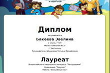 Поздравляем Бакееву Э., ученицу 1А кл. лауреата Всероссийского конкурса для детей и педагогов «Рассударики» в номинации «Рисунок» (руководитель: педагог-психолог – ШумиловаТ.М.).