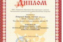 Петрова М., ученица 10 кл. нашей гимназии заняла 1 место в муниципальном этапе республиканского межведомственного конкурса сочинений (учитель Хайруллина С.В.).