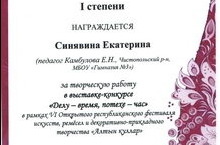 Синявина Е., ученица 7б кл. награждена дипломом 1 степени за творческую работу в выставке-конкурсе «Делу - время, потехе - час в номинации «Лоскуток к лоскутку» (руководитель: Камбулова Е.Н.).