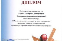 Поздравляем Юдину Е., ученицу 2А кл., лауреата заочного тура в номинации «Проекты патриотического направления» (Куратор: Куракина Е.Л.).