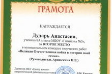 Поздравляем Дударь А., ученицу 8А кл., призера муниципального конкурса творческих работ «Великая Отечественная война в истории моей семьи» (рук.: Арнюскина Н.В.). Учащимся 5В кл., Фахрутдинову З. и Ахмадиевой А., вручены грамоты за активную гражданскую позицию (рук.: Шарифуллина Г.А.).