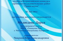 Медведева Дарья, ученица 9в кл. - лауреат всероссийского конкурса проектно-исследовательских работ «Грани науки» (куратор: Чикрина В.А.).