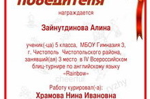 Поздравляем участников IV Всероссийского блиц-турнира по английскому языку “Rainbow”: Кулясову Д., Логинову К., 3В кл., Валдавину А., Левину Т., Лёксину А., 8А кл., Ивахову А., 8Б кл., Зайнутдинову А., 5Б кл., занявшую 3 место и получившую Диплом победителя (учитель Храмова Н.И.).