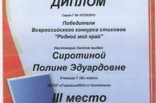 Ученица 7 Б кл. нашей гимназии Сиротина Полина заняла 3 место во Всероссийском конкурсе стихов «Родной мой край» (учитель: Сидорова В.А.).