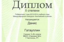 Гатауллин Данис, ученик 9в кл. - победитель I тура 2013-2014 учебного года международного конкурса «Английский в школе». Данис награжден дипломом 2 степени (учитель: Ишмурадова Н.М.).