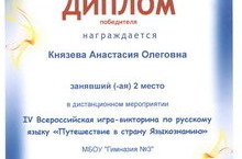 Поздравляем Князеву Анастасию, ученицу 7В класса, занявшую 2 место в дистанционном мероприятии «IV Всероссийская игра-викторина по русскому языку «Путешествие в страну Языкознания» (учитель Хайруллина С.В.).