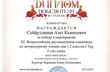 Поздравляем Сайфутдинова Азата, ученика 2а класса за победу в мероприятии «III Всероссийская дистанционная олимпиада по литературному чтению». Азат награжден дипломом III степени (учитель: Куракина Е.Л.).