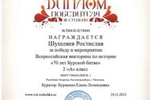 Поздравляем Шушляева Ростислава, Юдину Екатерину учащихся 2а класса за победу в мероприятии «Всероссийская викторина по истории «70 лет Курской битве». Катя заняла 2 место, Ростислав - 3 место (учитель: Куракина Е.Л.).