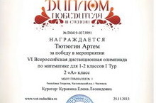 Поздравляем Тютюгина Артема, ученика 2а класса за победу в мероприятии «IV Всероссийская дистанционная олимпиада по математике». (учитель: Куракина Е.Л.).
