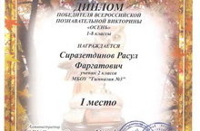 Сиразетдинов Расул, ученик 2г класса занял 1 место в викторине «Осень» (учитель Аделева А.А.).