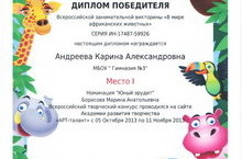 Поздравляем Андрееву Карину, Винокурову Дарью, Хусенова Артема, Аникину Дарью с победой во всероссийской занимательной викторине «В мире африканских животных».(куратор: Борисова М.А.).