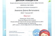 Поздравляем Винокурову Дарью, Хусенова Артема, Аникину Дарью с победой во всероссийской занимательной викторине «День Учителя» (куратор: Борисова М.А.).