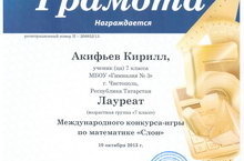 Поздравляем призеров всероссийского уровня Международного конкурса по математике «Слон»: Мифтахову Эльмиру и Тягущева Данилу, 10Б кл.(учитель Иванов Н.М.); лауреатов Акифьева Кирилла, 7В кл.(учитель Назарова М.А.), Строкина Дмитрия, 11 кл.(учитель Иванов Н.М.) и учащихся 9А кл. Сизову Марину, Индейкина Дениса (учитель Горшкова Г.М.).