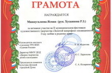 Поздравляем Миннугалееву Ясмин, ученицу 2 г класса (руководитель: Хусаинова Р.З.) за 3 место во II муниципальном фестивале художественного творчества.