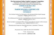 Cертификаты участников Международного Интернет (online) конкурса по английскому языку “Amber Star” получили: Валеева Алина (4В кл.), Михайлова Злата (11А кл.), Сахарова Вероника (4А кл.) (учитель Храмова Н.И.), Гайнатуллина Регина (6А кл.), Ильичев Илья (5А кл.), Мифтахова Эльмира (9В кл.), Набиуллина Айгуль (11Б кл.) (учитель Шурыгина Л.В.).