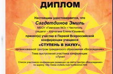 Сагдетдинов Эмиль, ученик 2Б кл. (учитель: Корчагина Е.Ю.) принял участие в Первой Всероссийской конференции учащихся «Ступень в науку».