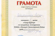 Гайнутдинов Артур, ученик 2б кл. занял 2 место в блиц-турнире по шахматам, посвященном Победе в Великой Отечественной Войне.
