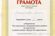 Афанасьев Дмитрий, ученик 4г кл. занял 1 место в Первенстве Чистопольского муниципального района по шахматам.