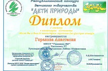 Горелова Анастасия, ученица 4 В класса заняла 1 место в Республиканском конкурсе «Дети природы» (Учитель: Хуснутдинова Л.Ш.).