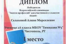 Салахова Алина, ученица 2А класса заняла 1 место во Всероссийской олимпиаде (куратор: Зиганшина Л.С.).
