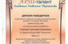 Горелов Григорий, ученик 2Б кл. занял 1 место в конкурсе на сайте Академии развития творчества «АРТ - талант» (куратор: Зиганшина Л.С.).