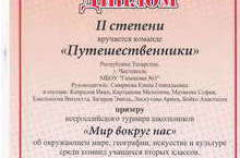 Диплом II степени вручен команде "Путешественники": Руководитель: Смирнова Елена Геннадьевна в составе: Капралов Иван, Карташова Мелитина, Матвеева София, Емельянова Виолетта, Загиров Эмиль, Лоскутова Арина, Бойко Анастасия.