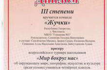 Диплом III степени вручен команде "Жучки": Руководитель: Семенова Татьяна Николаевна в составе: Самойлычев Михаил, Зверев Семен, Казакова Валерия, Симахина Алла, Васильева Анастасия, Зайнутдинова Алина.