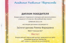 Залялетдинова Римма , ученица 4г класса участвовала во Всероссийском творческом конкурсе для учащихся 1-4 классов «Волшебный мир сказки» и заняла 1 место (руководитель: Саттарова Л.Х.)