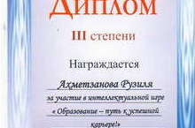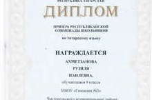 Ахметзанова Рузиля, ученица 9 класса, награждена дипломом призера республиканской олимпиады школьников по татарскому языку. (Руководитель: Закирова Г.Н.).