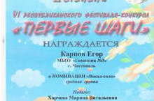 В Набережных Челнах прошел республиканский фестиваль-конкурс «Первые шаги». Карпов Егор, ученик 5 Г кл. награжден Дипломом II степени, Губайдуллина Гульшат, ученица 5А кл. награждена Дипломом. (Руководитель: Харчева М.В.)