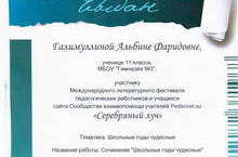 Галимуллина Альбина, ученица 11 класса, участвовала в Международном литературном фестивале педагогических работников и учащихся «Серебряный луч».