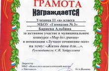 Бариева Альбина, ученица 11А класса принимала участие в муниципальном конкурсе «Мир без границ»