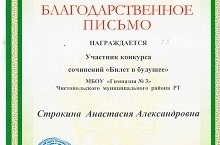 В муниципальном конкурсе сочинений «Билет в будущее» награждена Строкина Анастасия, ученица 7б класса