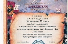 Дипломом победителя III степени награждены Пискунов Даниил, Карташова Полина учащиеся 2А класса (куратор: Смирнова Е.Г.)
