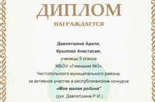 Подведены итоги республиканского конкурса «Моя малая родина». Призером этого конкурса в номинации «Гуманитарно-экологические исследования» стала Давлетшина Ляйсан, ученица 11 класса. Дипломом за активное участие награждены Давлетшина Аделя и Крылова Анастасия, ученицы 6 класса (руководитель: Давлетшина Р.И.). Поздравляем!