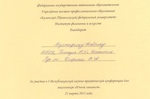 27 апреля 2012 года в торжественной обстановке состоялось награждение лауреата в номинации "За вклад в профилактику правонарушений среди учащихся ОУ", был вручен Диплом и ценный подарок.
