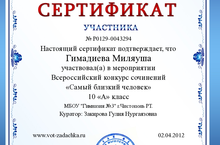 Центр развития мышления и интеллекта награждает Сертификатом участника Гимадееву Миляушу, ученицу 10А класса (куратор: Закирова Г.Н.) за участие в дистанционном мероприятии Всероссийского конкурса сочинений «Самый близкий человек».
