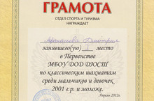 Поздравляем Афанасьева Дмитрия, ученика 3 г класса, занявшего 1 место в Первенстве МБОУ ДОД ДЮСШ по классическим шахматам среди мальчиков и девочек 2001 г.р. и моложе.